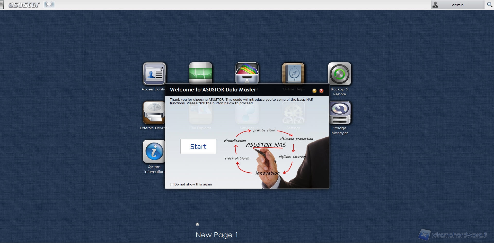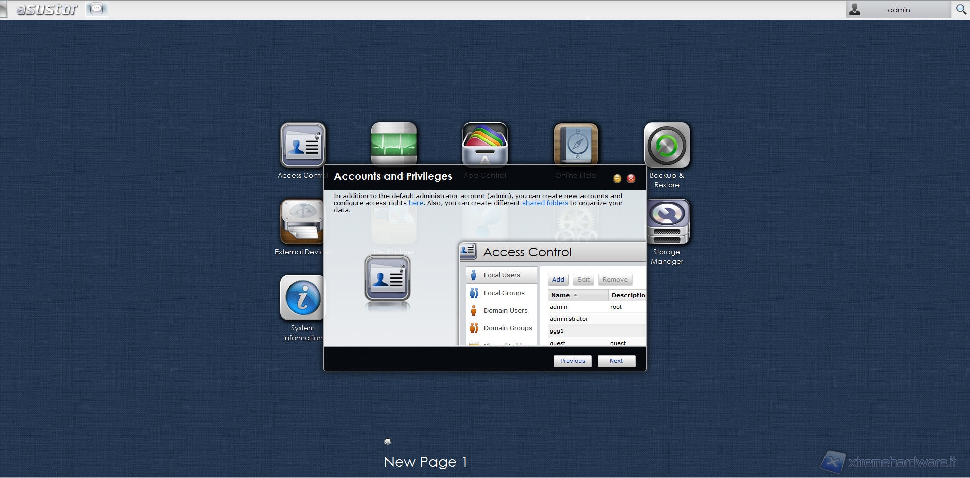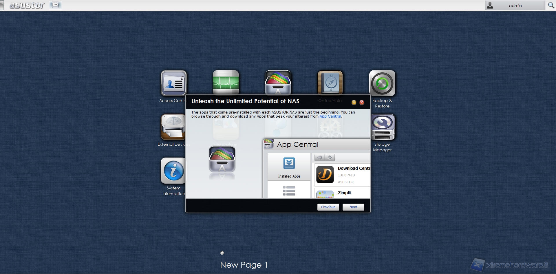 L’assistente ci mette a disposizione scorciatoie, con tanto di descrizione, in grado di farci raggiungere in breve tempo le funzioni principali del sistema come ad esempio lo “Storage Manager”, sezione che si occupa della gestione e del settaggio dei volumi di storage, l’“Access Control”, pannello che permette all’utente di creare nuovi utenti o rimuoverli, il menù “Service” grazie al quale possiamo abilitare o disabilitare i vari servizi di sistema o ancora il pannello “App Central”, utilissimo per poter scaricare ed installare numerose applicazioni disponibili sul database di Asustor ed infine il classico menù “Setting” ove l’utente avrà la libertà di impostare i parametri di sistema come più gli aggrada.