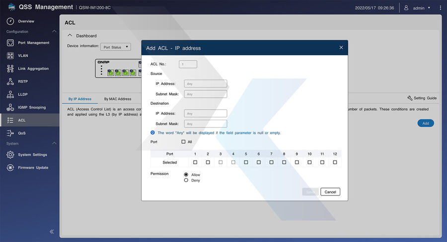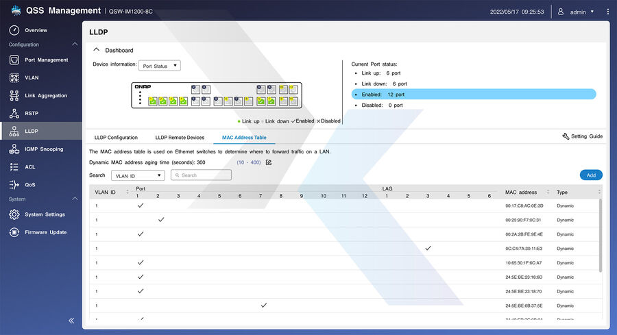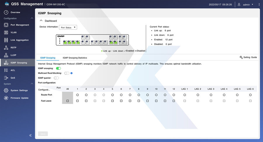 A seguire poi troveremo schermate con potenti funzioni di sicurezza e di sistema (tra cui ACL, LLDP, RSTP e Flow Control) per aiutare gli amministratori a migliorare l'affidabilità della rete), oltre a schermate per gestire le funzioni di controllo della larghezza di banda e dei pacchetti (come LACP, VLAN, QoS e IGMP Snooping) per migliorare le prestazioni della rete tramite il raggruppamento IP e la gestione della larghezza di banda. Infine, anche il QSW-IM1200-8C supporta il protocollo RSTP (Rapid Spanning Tree Protocol).