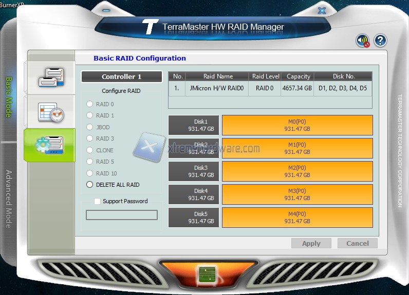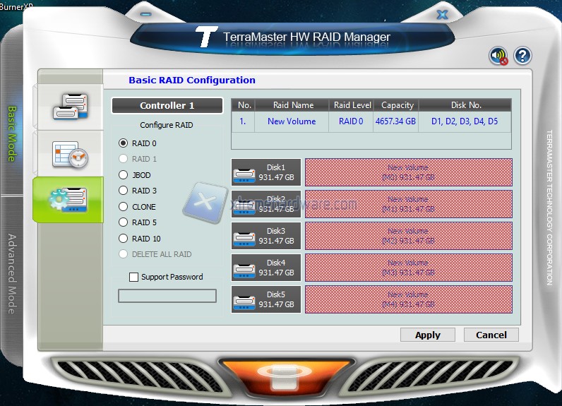 Tramite la “Basic Mode” selezioniamo il volume da creare (nel nostro caso RAID 0) e proseguiamo cliccando su “Apply”.