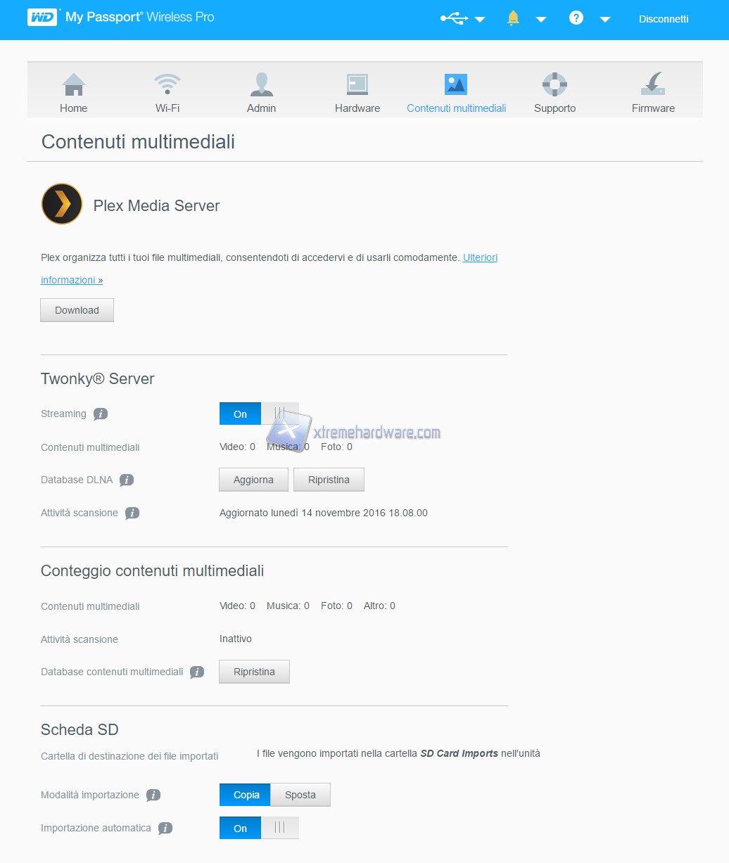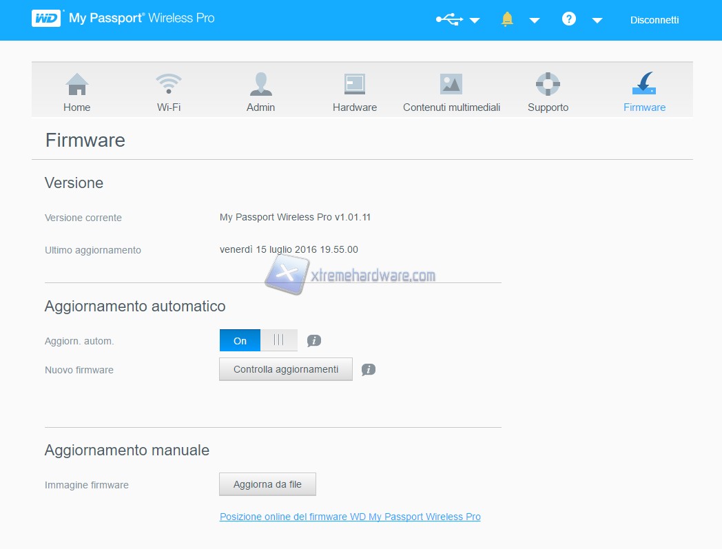 Ora analizziamo il software di gestione del Western Digital My Passport. Il software non va installato, infatti basta digitare sulla barra di ricerca del nostro browser preferito il suddetto indirizzo: 192.168.60.1. Nella prima pagina, contraddistinta dall’icona Home, possiamo osservare lo status dell’Hard Disk, come ad esempio: carica della batteria integrata, capacità residua / utilizzata e versione del firmware.