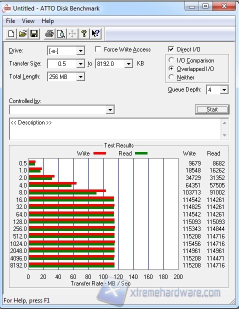 Vediamo qui come il transfer rate, sia in lettura che scrittura, tenda quasi all'ottimo valore di 115 MB/s, tranne che i risultati ottenuti con blocchi più piccoli, che registrano prestazioni inferiori.