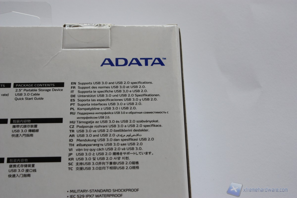 Posteriormente troviamo molte informazioni e dettagli utili. Sono presenti le specifiche del drive in 9 lingue di cui manca però l’italiano, la scritta che ci ricorda che tale drive è USB 3.0 e alcune delle caratteristiche che rendono l’unità resistente come gli Standard Qualitativi di test di grado Militare, rivestimenti in gomma resistente ad urti e cadute e il brevetto IEC 529 IPX7 che certifica la protezione del drive da liquidi. Per finire vengono riportate tutte le caratteristiche dell’azienda e non.