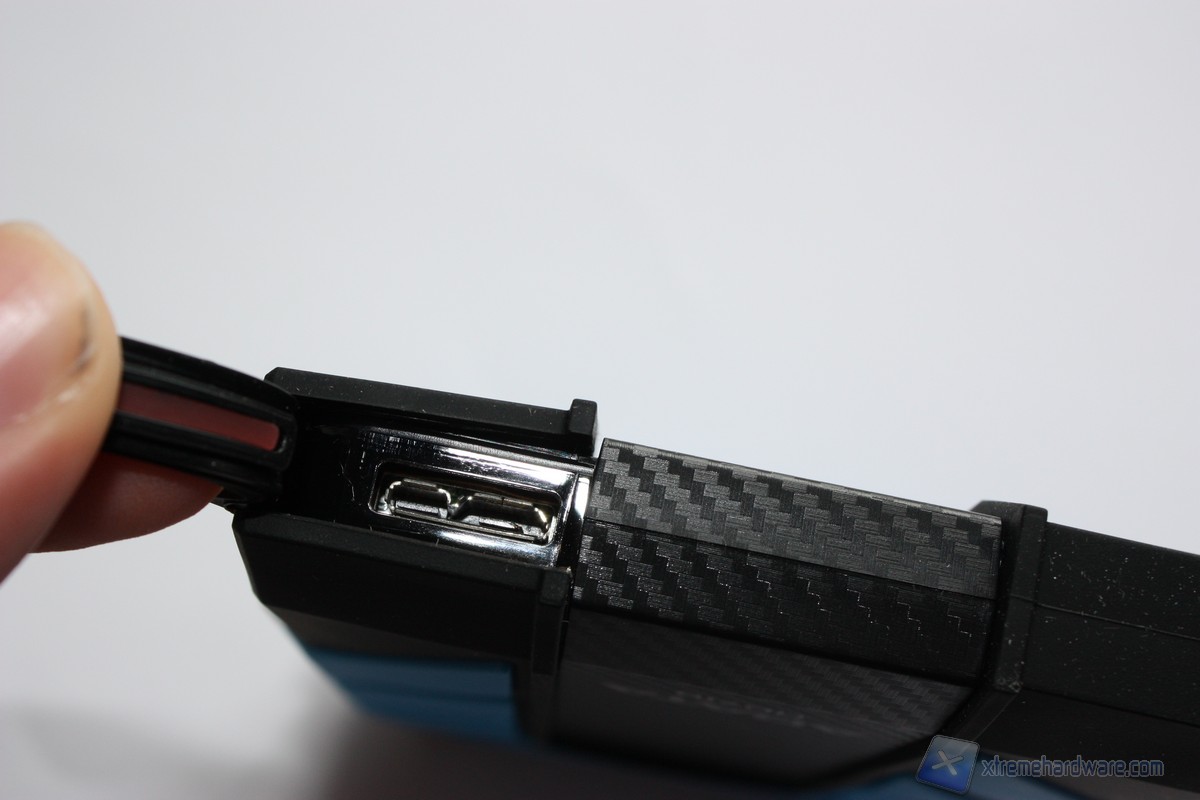 Come avevamo accennato in precedenza la superfice laterale del drive è caratterizzata da un tunnel-scanalatura realizzato sempre in gomma dove trova posto il cavo USB 3.0 una volta terminato l’utilizzo del drive. Tale feature è molto interessante per evitare di perdere o scordare il cavetto di collegamento. L’HD710 presenta inoltre una ulteriore protezione in gomma sul connettore del drive, spesso una delle principali cause di malfunzionamento degli hard disk esterni.