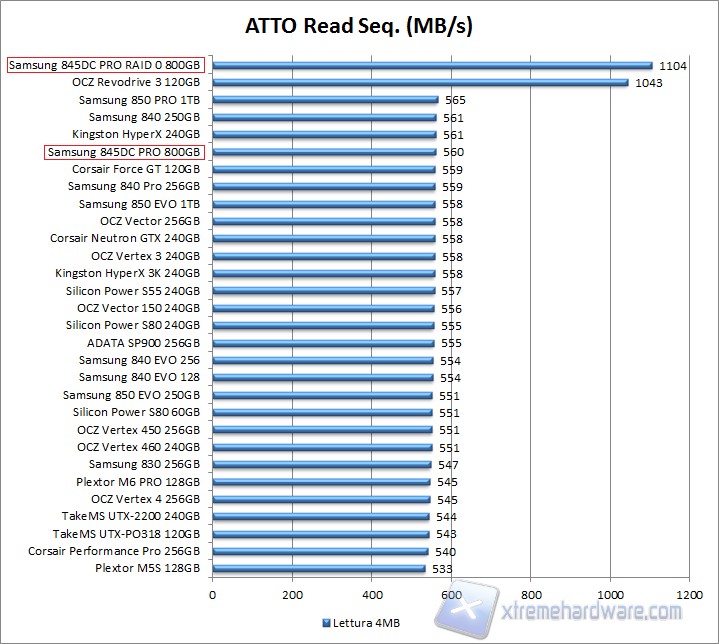 Le prestazioni con ATTO sono molto buone per quanto riguarda la lettura sequenziale che lo posizionano alla pari degli SSD Consumer più veloci, invece la scrittura sequenziale è leggermente sotto la media. Di fatto in questo benchmark gli SSD attuali sono limitati dalla banda messa a disposizione dal SATA 6 Gb/s che inizia a mostrare i suoi limiti. Configurando i nostri due SSD in RAID 0 otteniamo le migliori prestazioni mai registrate in questo benchmark.