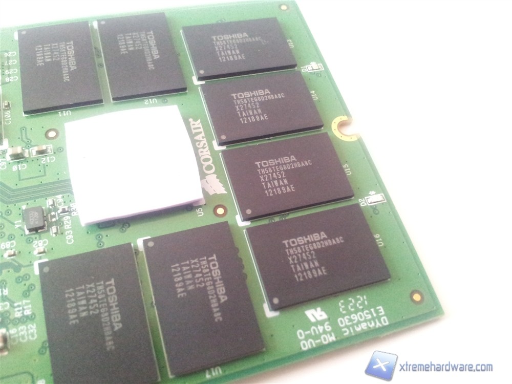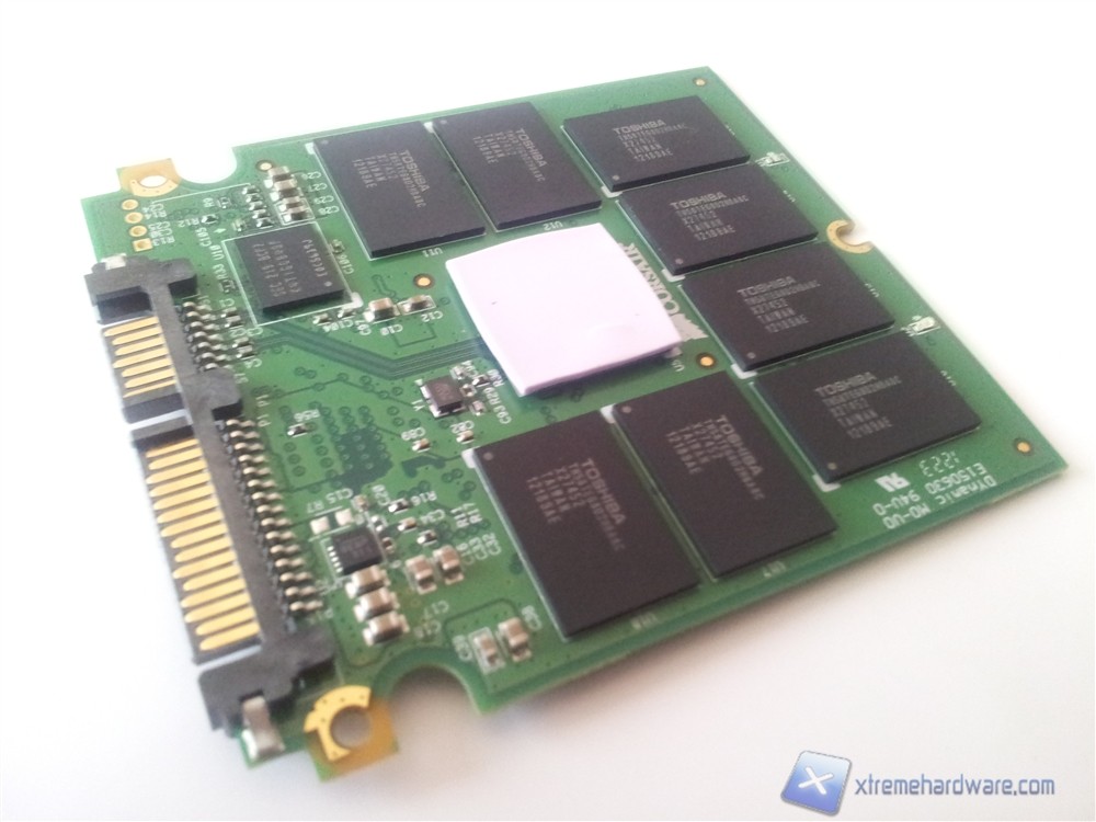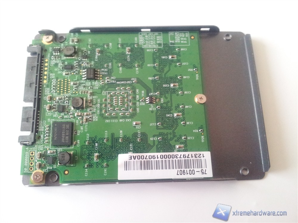 Sul retro del PCB sono facilmente identificabili gli 8 moduli di memoria NAND Flash da 32GB ciascuno per un totale quindi di 256GB, i moduli sono prodotti da Toshiba ma, a differenza di quelli utilizzati per il Performance PRO, quelli del Neutron GTX sono a 24nm (contro i 32 del performance) e sono in grado di operare a 166MB/s, il modello utilizzato è il TH58TEG8D2HBA8C. I due chip di memoria DRAM DDR3 sono prodotti da Samsung ed operano ad una frequenza di 800MHz, ogni modulo è di 128MB per un totale di 256MB di cache.
