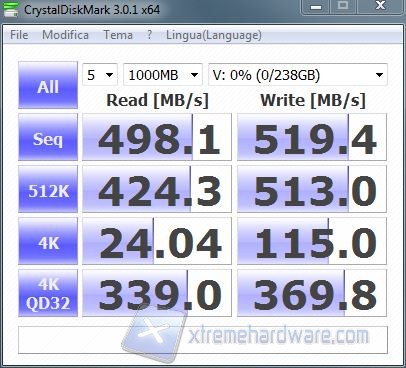 CrystalDiskMark è un utilissimo software per misurare le performance in lettura e in scrittura in modo sequenziale (sequential) e casuale (random), grazie al pieno supporto del NCQ (Native Command Queuing) l'ordine degli IOPS viene ottimizzato in modo da migliorare le prestazioni di input/output con una Queue Depth (file in coda) di 32, tale test consente di osservare il comportamento del drive durante il trasferimento di numerosi file con dimensioni ridotte.
