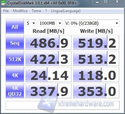 Come abbiamo già avuto modo di notare nelle precedenti review, i controller di ultima generazione, contrariamente ai SandForce, non variano le proprie prestazioni in base al tipo di dati utilizzati, anche in questo caso infatti non c'è un peggioramento passando dalla modalità 0-fill (scrittura di soli zeri) alla modalità standard. Ciò vuol dire che i dati non vengono compressi durante la scrittura e che le prestazioni sono costanti indipendentemente dal contenuto. Ad ogni modo le prestazioni sono al di sopra di quelle riscontrate con il Vertex 4, collocandosi spesso nella parte alta della nostra classifica, a meno della lettura 4k. Ottime le performance con QD32, dove in scrittura fa registrare il valore più alto, mentre in lettura viene battuto solo dal Vector.