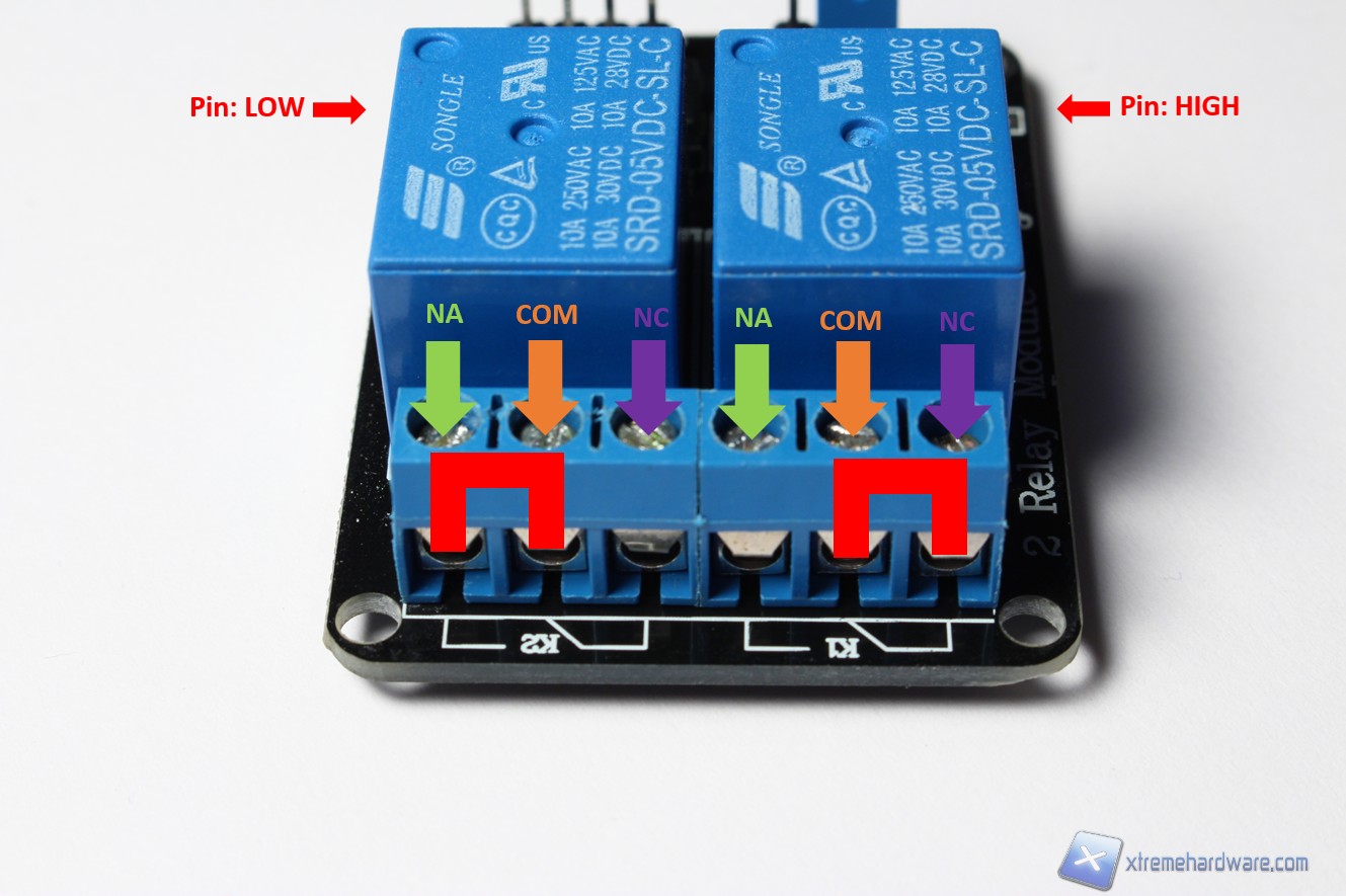 Una volta seguiti questi tre semplici passaggi potremo tranquillamente controllare i nostri due relè impostando l'uscita dei due pin appositi (nel mio caso 8 e 9) in modalità LOW (basso, cioè spento) o HIGH (alto, cioè acceso) .Attenzione però: le due modalità appena descritte riguardano i pin e non i nostri due relè, infatti essi reagiranno con l’effetto contrario cioè se il pin sarà in modalità LOW il relè si ecciterà quindi chiuderà il circuito formato dal comune (COM) e il normalmente aperto (NA) mentre se il pin sarà in modalità HIGH il relè si “rilasserà” e andrà a chiudere sempre il comune, ma questa volta con il pin normalmente chiuso (NC).