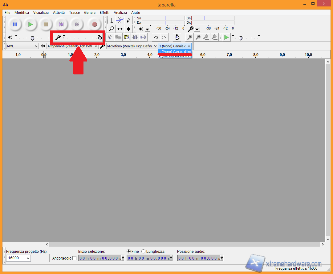 Apriamo Audacity, ma questa volta, prima di passare all’azione, sarà necessario impostare alcuni parametri: per prima cosa dovremo cambiare il numero dei canali che verranno registrati dal nostro microfono e spostarlo, come per DSpeech, a 1 (cioè mono) e poi aumentare il volume dell’ingresso (microfono) al massimo, con lo slider orizzontale in alto a sinistra.