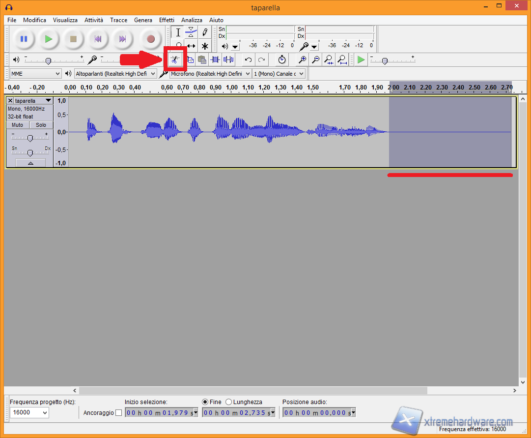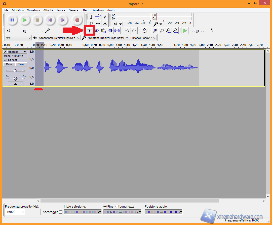 Adesso passiamo alla registrazione effettiva della frase premendo il pulsante REC, e una volta fatto ciò procediamo nello stesso modo descritto in precedenza, cioè tagliamo le parti inutili selezioniamo tutto e salviamo la nostra frase in formato wav.